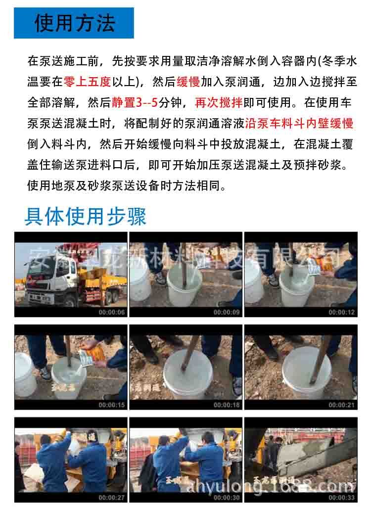 在泵送施工前,先按要求用量取潔凈溶解水倒入容器內(nèi),然后均勻緩慢的加入泵車潤管劑(泵潤通),邊加入邊攪拌至全部溶解,然后靜置3分鐘,再次攪拌即可使用。在使用車泵泵送混凝土?xí)r,將配制好的潤管劑溶液沿泵車料斗內(nèi)壁緩慢倒入料斗內(nèi)并使之滿過泵管進(jìn)料口,然后開始緩慢向料斗中投放混凝土,同時(shí)開始加壓進(jìn)行混凝土及預(yù)拌砂漿泵送作業(yè)。使用地泵作業(yè)時(shí)方法相同,但應(yīng)注意適度調(diào)整產(chǎn)品及溶解水的用量。使用地泵時(shí),總長度不得超過100米,如需超過100米地泵使用,則向公司購買地泵專用泵潤通。