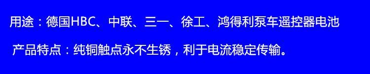 歸屬行業(yè):泵車配件 汽車泵配件 泵車遙控器電池 HBC電池HBC充電器 三一電池