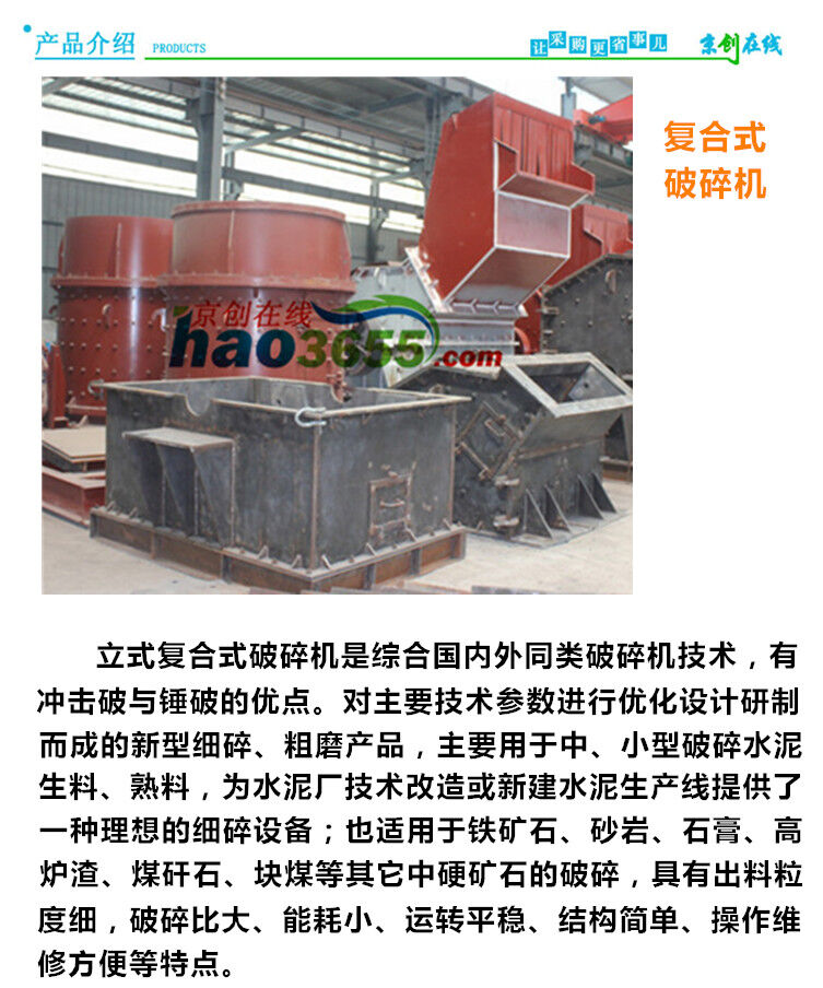 立式復(fù)合式破碎機(jī)1500簡稱為復(fù)合破,是破碎生產(chǎn)線和制砂生產(chǎn)線中常用設(shè)備之一。復(fù)合破碎機(jī)是一種無篩條、可調(diào)式細(xì)碎設(shè)備,可廣泛適用于水泥廠的生料、熟料細(xì)碎作業(yè),同時(shí)也可用于白云石、焦寶石、鉛鋅礦、蛇紋石、高爐渣、煤矸石、磷礦石等中等硬度物料的細(xì)碎作業(yè),特別適用于硬質(zhì)石灰?guī)r、白云巖、花崗巖、玄武巖等人工造砂或高速公路路面石料的加工破碎。