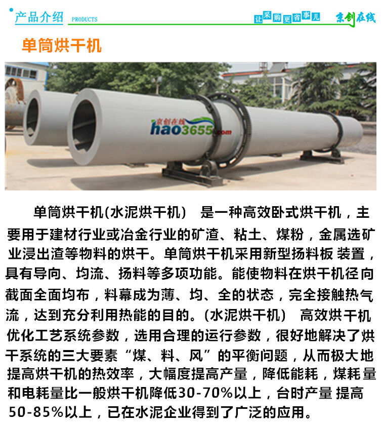 單筒烘干機(jī)φ3×25,也叫滾筒干燥機(jī),它廣泛用于建材、冶金、化工、水泥工業(yè)烘干礦渣石灰石、煤粉、礦渣、粘土等物料。該機(jī)主要由回轉(zhuǎn)體、揚(yáng)料板,傳動(dòng)裝置,支撐裝置及密封圈等部件組成。具有結(jié)構(gòu)合理,制作精良,產(chǎn)量高,能耗低,運(yùn)轉(zhuǎn)方便等優(yōu)點(diǎn)。