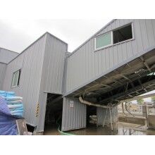 1)料廠封裝:立柱采用450*5角鋼,立柱角鋼間的橫向聯(lián)系及斜撐采用∠30角鋼;拱架采用Φ48*2mm鍍鋅鋼管,斜撐及聯(lián)系采用Φ21*1.5mm鍍鋅鋼管及∠30角鋼。屋面檁條采用12#鍍鋅C型鋼。屋面彩鋼棚采用0.3mm厚藍色彩鋼板,頂棚排水采用630*1.2mm鍍鋅檐溝。圍擋檁條采用12#鍍鋅C型鋼,斜撐采用Φ16mm的圓鋼拉筋,彩鋼棚采用0.3mm厚藍色彩鋼板。