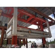 移動(dòng)式掰板機(jī)工作流程:蒸養(yǎng)完成的成品連同模具側(cè)板被模具側(cè)板運(yùn)輸裝置送至移動(dòng)掰板機(jī)下,頂升裝置啟動(dòng),將坯體連同側(cè)板頂起,移動(dòng)掰板機(jī)從上層至下層依次掰開(kāi),掰至底層后,移動(dòng)掰板機(jī)將全部成品夾起,并移至砌塊成品打包線上,將砌塊放置在該打包線上,移動(dòng)掰板機(jī)繼續(xù)將加氣板移動(dòng)至加氣板輸送打包線上,重新返回。掰扳機(jī)專門(mén)負(fù)責(zé)坯體切開(kāi)之后(經(jīng)蒸養(yǎng))又重新粘連在一起,在自動(dòng)打包之前將其一塊一塊分離,消除由于粘連造成的廢、次品,同時(shí)保證打包線正常運(yùn)行。