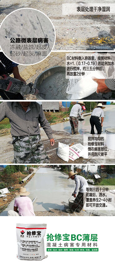 搶修寶BC薄層修補材料,可實現(xiàn)3毫米以上的超薄層快速修補,美觀度高,而且具有防凍和抗腐蝕性能。農(nóng)村公路的起砂病害用搶修寶BC薄層修補材料進行修補,受到了甲方及施工單位的認可,并且建立長期合作。