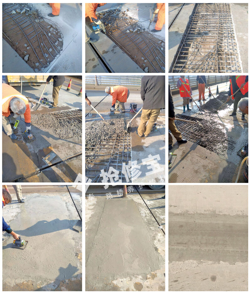 快速修補(bǔ)橋面公路的施工流程:修補(bǔ)基面處理——計(jì)算材料用量——材料攪拌振搗 抹面壓光——灑水養(yǎng)生——達(dá)到設(shè)計(jì)強(qiáng)度70%時(shí)開放交通