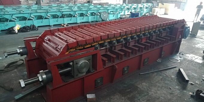 牽引鏈采用配套廠家的履帶鏈,節(jié)距誤差小,強(qiáng)度高,不宜變形,并且在使用期內(nèi)無(wú)須潤(rùn)滑,日常操作維修方便快捷。鏈板底全部采用錳鋼板制作,采用單圓弧搭接結(jié)構(gòu)形式,工作時(shí)始終處于相互搭接狀態(tài)。抗沖擊,耐磨損,鏈板之間不漏料,安全可靠。每個(gè)鏈板兩側(cè)采用導(dǎo)向板定位,通過(guò)8個(gè)螺栓與履帶鏈牢固連接,保證了鏈板相互之間咬合準(zhǔn)確。鏈板底板下面焊有加強(qiáng)筋板,鏈板運(yùn)行時(shí)有四列滾輪支撐,可保證承受大的物料沖擊而不變形。整機(jī)現(xiàn)場(chǎng)的粉塵、噪音狀況大為改善,工人操作環(huán)境得到了明顯改進(jìn)。
