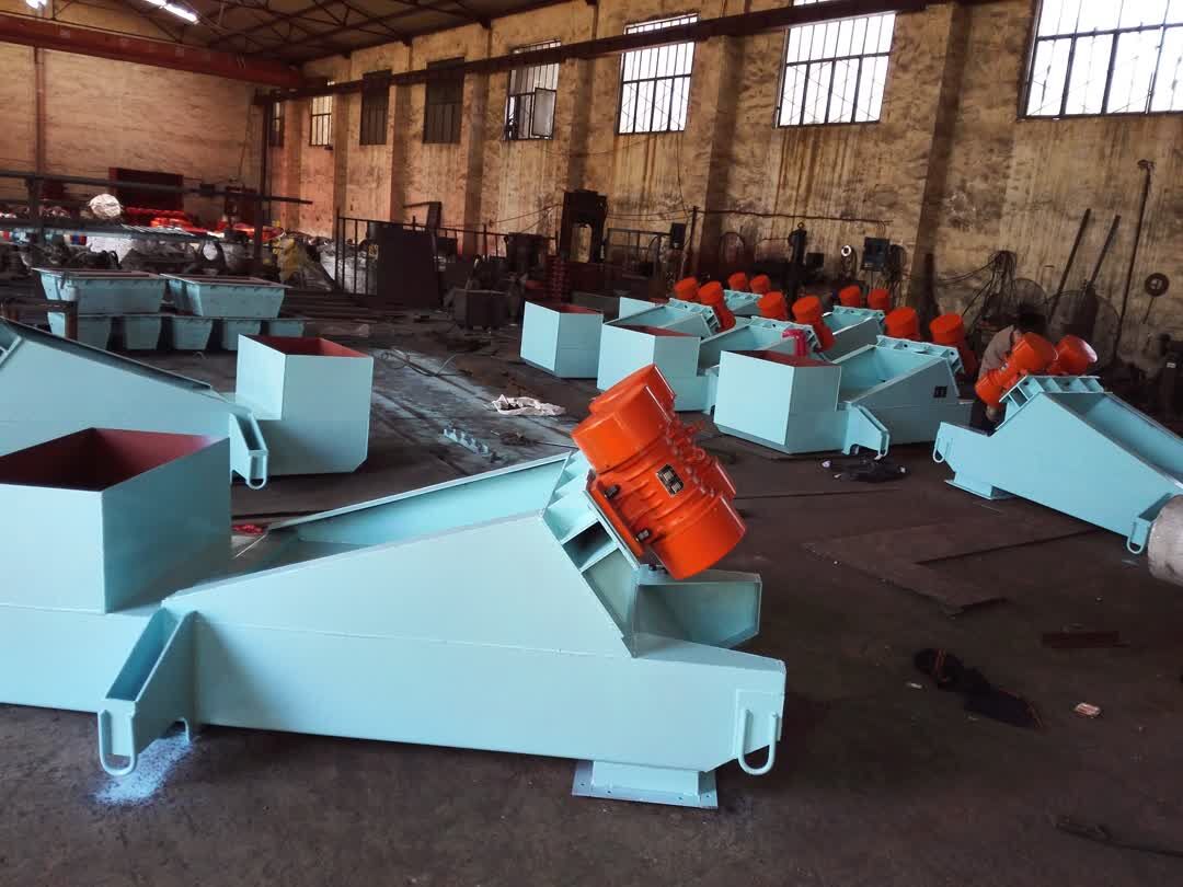 電機(jī)振動(dòng)給料機(jī)的給料過(guò)程是利用特制的振動(dòng)電機(jī)驅(qū)動(dòng)給料槽沿傾斜方向作周期直線往復(fù)振動(dòng)來(lái)實(shí)現(xiàn)的,當(dāng)給料槽振動(dòng)的加速度垂直分量大于重力加速度時(shí),槽中的物料將被拋起,并按照拋物線的軌跡向前跳躍運(yùn)動(dòng),拋起和下落1/50秒內(nèi)完成,由于振動(dòng)電機(jī)的連續(xù)激振,給料槽連續(xù)振動(dòng),槽中的物料則連續(xù)向前跳躍,以達(dá)到給料目的。