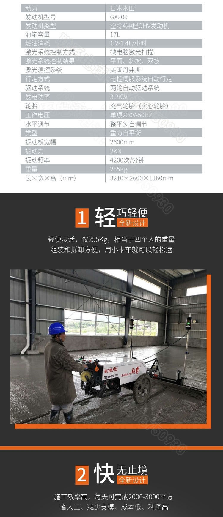 一、減少人力成本,翻倍提高效率:傳統(tǒng)工藝施工人數(shù)較多,需要支模板(槽鋼)、打點、攤鋪。需要人力20人左右。每天施工面積在700平方。采用混凝土激光整平機總?cè)藬?shù)比傳統(tǒng)工藝減少一多半??蓡稳瞬僮鳌C刻焓┕っ娣e在2500平---3500平,大大降低了人力成本。