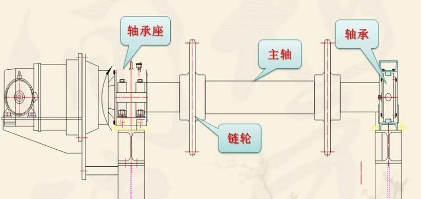 該裝置主要由軸、鏈輪、支承輥等件組成。兩端支撐為滾動(dòng)軸承,主軸與減速器、空心軸套裝在一起,通過鎖緊盤將其二者連接到一起,達(dá)到傳遞扭矩的要求,結(jié)構(gòu)緊湊。