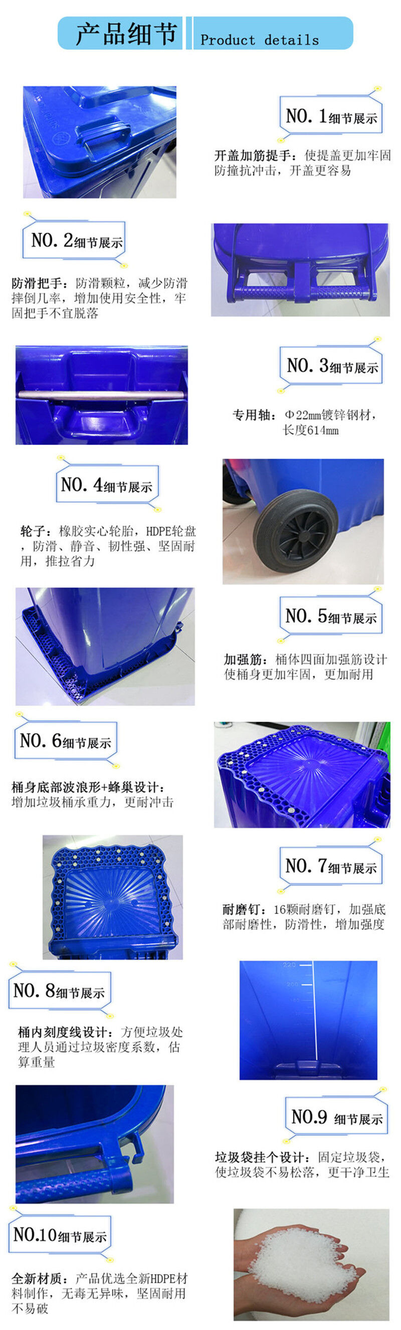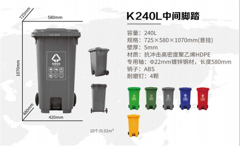 240L塑料垃圾桶/塑料環(huán)衛(wèi)垃圾桶,桶蓋密合,可防止異味散發(fā),雨水侵入,蚊蠅滋生,桶身可相互套疊,方便運(yùn)輸,節(jié)省儲(chǔ)運(yùn)空間與費(fèi)用,桶內(nèi)外表面光潔,便于倒空垃圾與清洗,垃圾桶設(shè)計(jì)符合 人體工程學(xué),輕便耐用,移動(dòng)靈活。產(chǎn)品賣(mài)點(diǎn)。240L塑料垃圾桶價(jià)格不浪費(fèi),讓城市更美觀少占地:生活垃圾中有些物質(zhì)不易降解,使土地受到嚴(yán)重侵蝕。垃圾分類(lèi),去掉能回收的,不易降解的物質(zhì),減少垃圾數(shù)量達(dá)50%以上。少環(huán)境污染:廢棄的電池含有金屬。約資源鎘等有害的物質(zhì)。