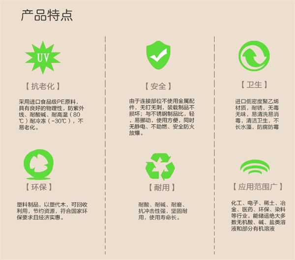 1、采用全新進(jìn)口聚乙烯PE料制作無(wú)毒、無(wú)味,質(zhì)輕堅(jiān)韌、安裝移動(dòng)簡(jiǎn)便,全部采用進(jìn)口塑料制成,不添加回料,質(zhì)量有保證。
