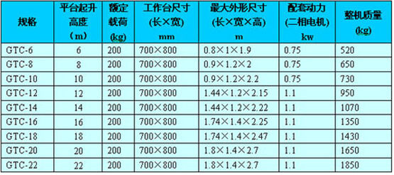 產(chǎn)品規(guī)格:該系列液壓升降平臺(tái)升降高度從6米到22米不等,設(shè)備升降裝置采用高強(qiáng)度冷拔管多級(jí)液壓套嵌結(jié)構(gòu),液壓缸四周并配以矩形防轉(zhuǎn)框架,使升降平臺(tái)升降平穩(wěn),安全可靠