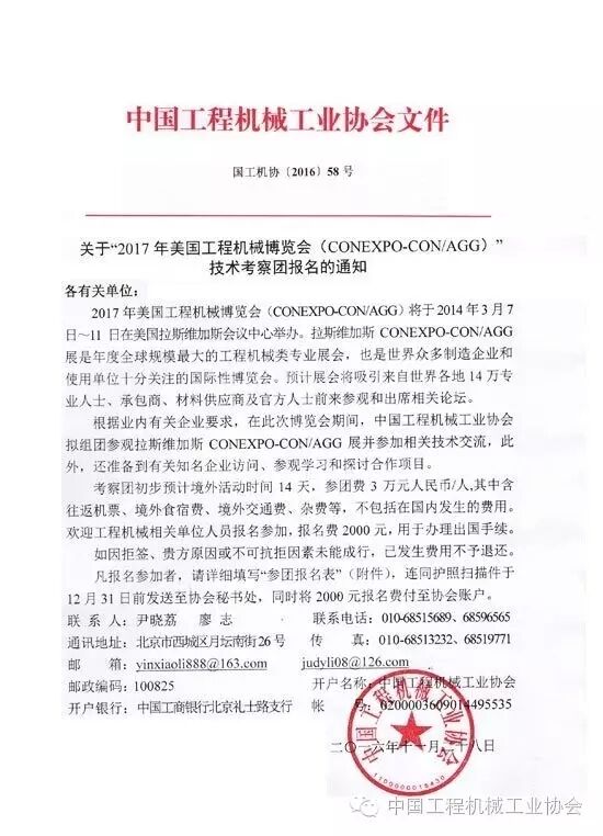 根據(jù)業(yè)內(nèi)有關(guān)企業(yè)要求,在此次博覽會期間,中國工程機械工業(yè)協(xié)會擬組團參觀拉斯維加斯CONEXPO-CON/AGG展并參加相關(guān)技術(shù)交流,此外,還準備到有關(guān)知名企業(yè)訪問、參觀學(xué)習(xí)和探討合作項目。
