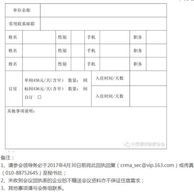 2、請參加研討會的企業(yè)于2017年4月30日前提交參會回執(zhí)表,以便妥善安排會議資料和住宿。