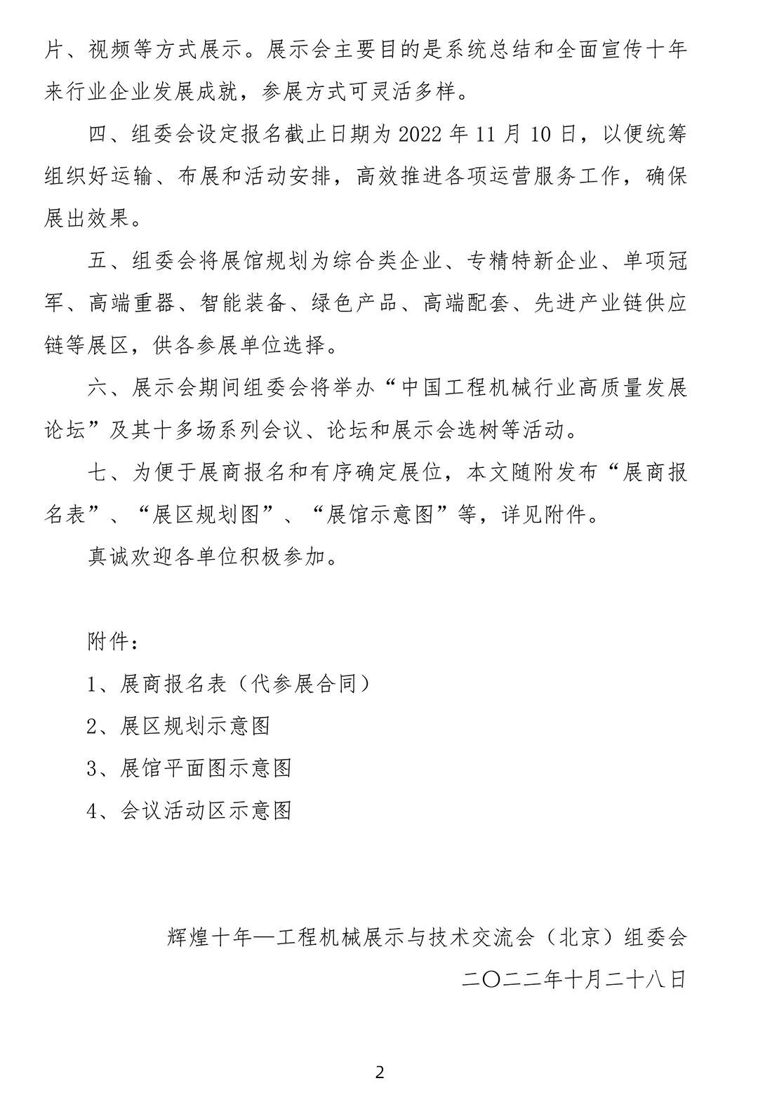自協(xié)會發(fā)布舉辦“輝煌十年——工程機械展示與技術(shù)交流會(北京)”(以下簡稱“展示會”)通知后,得到了各參展單位的快速響應(yīng)和積極支持,有的已經(jīng)報名大面積參展,有的正在履行審批程序或來電表示參加展出,組委會深表衷心感謝!為及時傳遞展會信息,服務(wù)好廣大展商,辦好本次展示會,現(xiàn)向廣大展商正式發(fā)出邀請,并將有關(guān)展示會方案說明如下:一、為充分展示黨的十八大以來工程機械行業(yè)各領(lǐng)域取得的發(fā)展成就,協(xié)會研究決定召開本次展示會,邀請廣大協(xié)會會員和產(chǎn)業(yè)鏈上下游企業(yè)參展,共同分享企業(yè)發(fā)展成就和謀劃行業(yè)美好未來。二、展示會于2022年12月1日至3日在北京冬奧會滑雪大跳臺項目舉辦地——北京首鋼會展中心舉辦。屆時協(xié)會將邀請政府部門、相關(guān)用戶、媒體朋友和廣大觀眾到展示會現(xiàn)場參觀交流。12月3日(周六)實施社會公眾開放日,讓社會觀眾充分體驗工程機械發(fā)展魅力。三、北京首鋼會展中心適合舉辦室內(nèi)高品質(zhì)展示會,室外面積有限,而且適合承重較輕的產(chǎn)品展出。組委會初步規(guī)劃總展出面積2萬平米左右,希望各參展企業(yè)提供產(chǎn)業(yè)鏈上下游的先進技術(shù)產(chǎn)品和高端裝備進行展出,大型設(shè)備和示范工程應(yīng)用等可通過模型、圖片、視頻等方式展示。展示會主要目的是系統(tǒng)總結(jié)和全面宣傳十年來行業(yè)企業(yè)發(fā)展成就,參展方式可靈活多樣。四、組委會設(shè)定報名截止日期為2022年11月10日,以便統(tǒng)籌組織好運輸、布展和活動安排,高效推進各項運營服務(wù)工作,確保展出效果。五、組委會將展館規(guī)劃為綜合類企業(yè)、專精特新企業(yè)、單項冠軍、高端重器、智能裝備、綠色產(chǎn)品、高端配套、先進產(chǎn)業(yè)鏈供應(yīng)鏈等展區(qū),供各參展單位選擇。六、展示會期間組委會將舉辦“中國工程機械行業(yè)高質(zhì)量發(fā)展論壇”及其十多場系列會議、論壇和展示會選樹等活動。七、為便于展商報名和有序確定展位,本文隨附發(fā)布“展商報名表”、“展區(qū)規(guī)劃圖”、“展館示意圖”等,詳見附件。