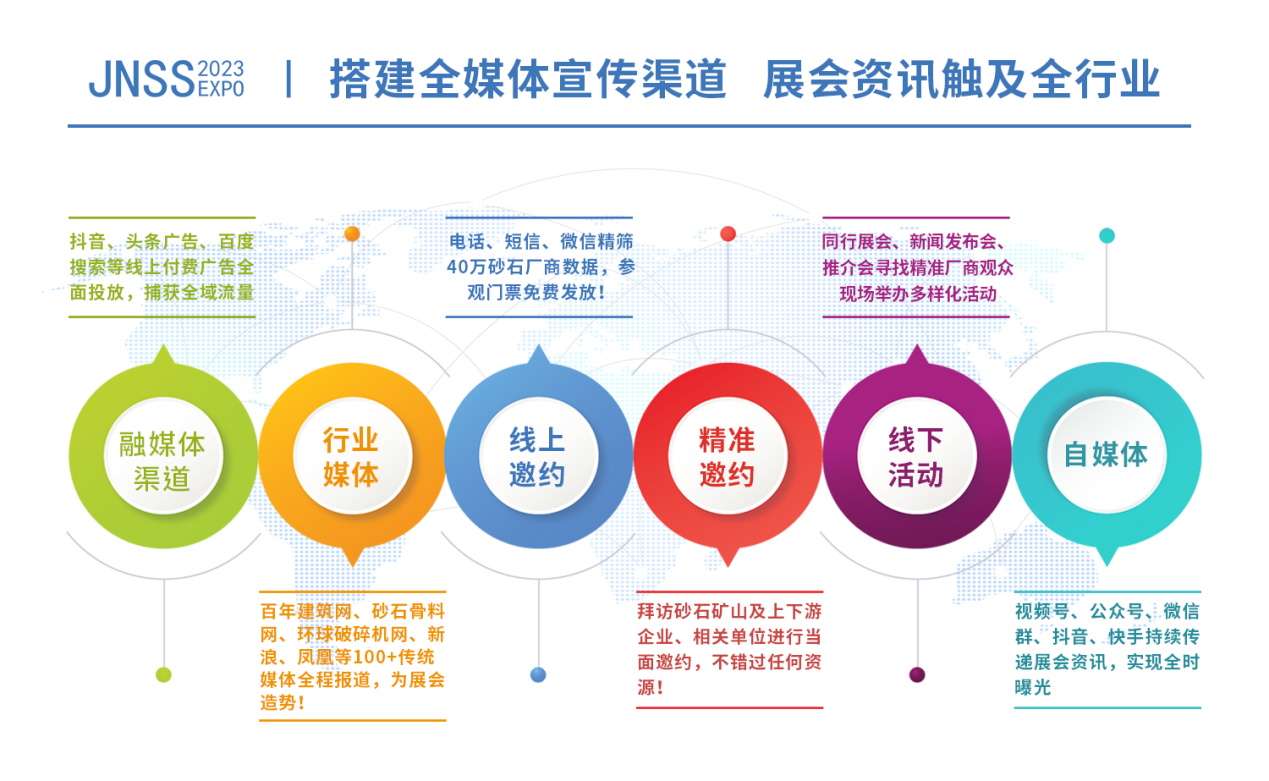 2023濟(jì)南砂石招展將持續(xù)加強(qiáng)宣傳力度,匯集線上線下、全方位、多角度優(yōu)質(zhì)買(mǎi)家,助推展商品牌打造與貿(mào)易合作。