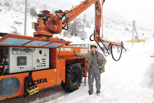 易穎志趕到工地后,發(fā)現(xiàn)設(shè)備油漆刮擦嚴(yán)重,許多部位變形,與客戶協(xié)調(diào)后,易穎志便開始檢測(cè)和開機(jī)調(diào)試。烏茲別克斯坦氣溫很低,夜間最低溫度達(dá)到了零下20多度,幾臺(tái)設(shè)備都在冰天雪地里,為保證設(shè)備盡快能使用,易穎志抵抗著極寒天氣在隧道外檢測(cè),做各種調(diào)試。由于設(shè)備發(fā)生過碰撞,機(jī)械變形問題較多,易穎志擔(dān)心設(shè)備漏油,所以對(duì)每個(gè)有可能漏油的地方,他都會(huì)鉆到車底細(xì)心檢查,隨后再檢查設(shè)備的各項(xiàng)動(dòng)作和功能是否正常。他自己檢測(cè)一遍后,再教工地上的當(dāng)?shù)貦C(jī)手如何使用設(shè)備、保養(yǎng)設(shè)備,并開機(jī)試料,及時(shí)給出配比意見。